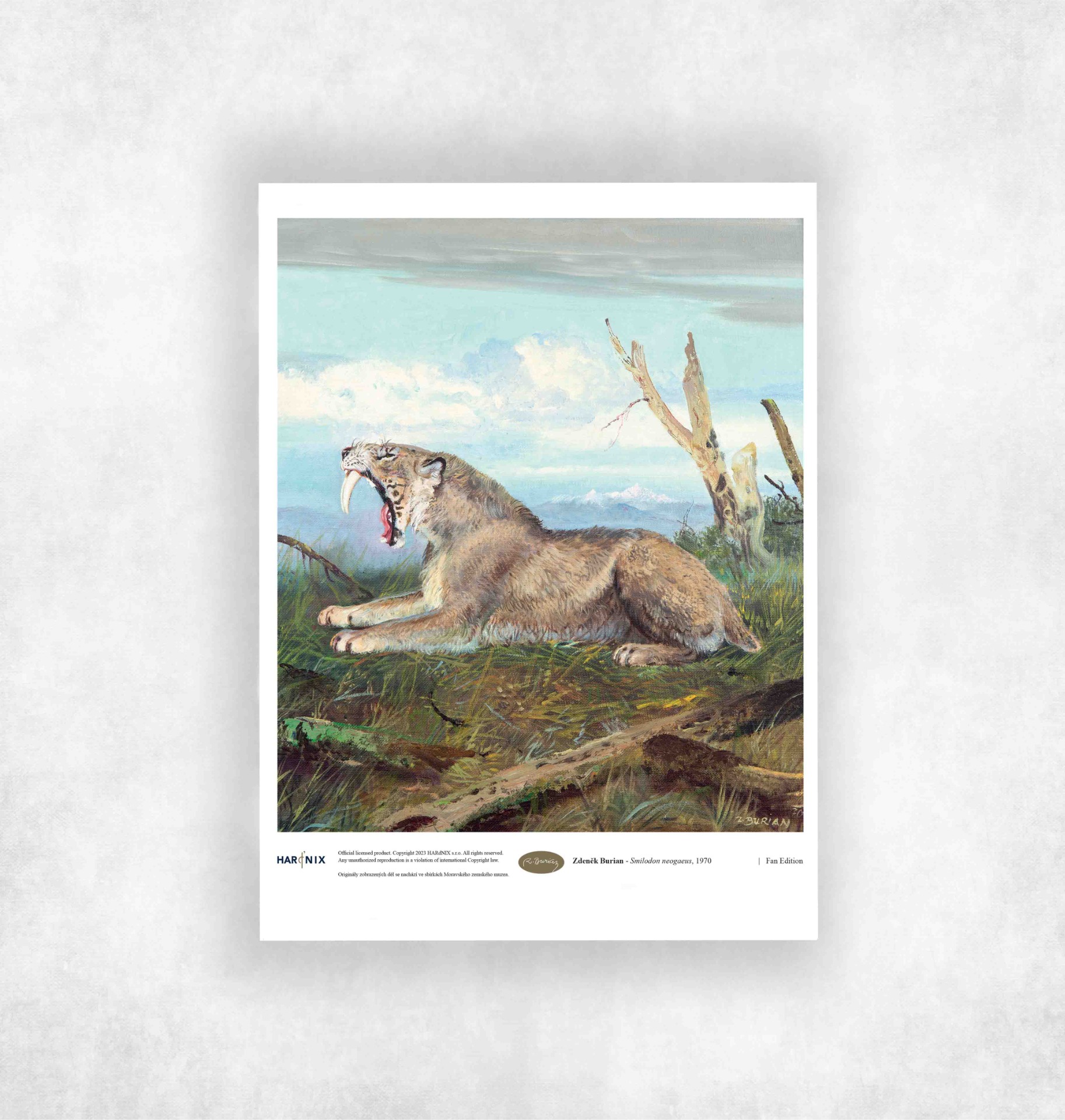 • Obraz,zobrazující šelmu rodu Smilodon, která není dnes považována za blízce příbuzného žádné moderní kočkovité šelmě. Dosahoval hmotnosti 300 vyjímečně až přes 400 kg.